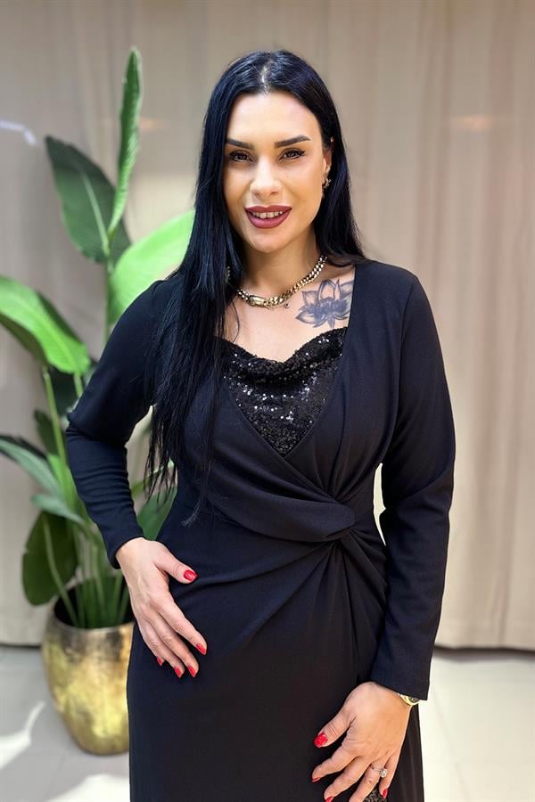Düğüm Detaylı Pullu Büyük Beden Elbise - Siyah