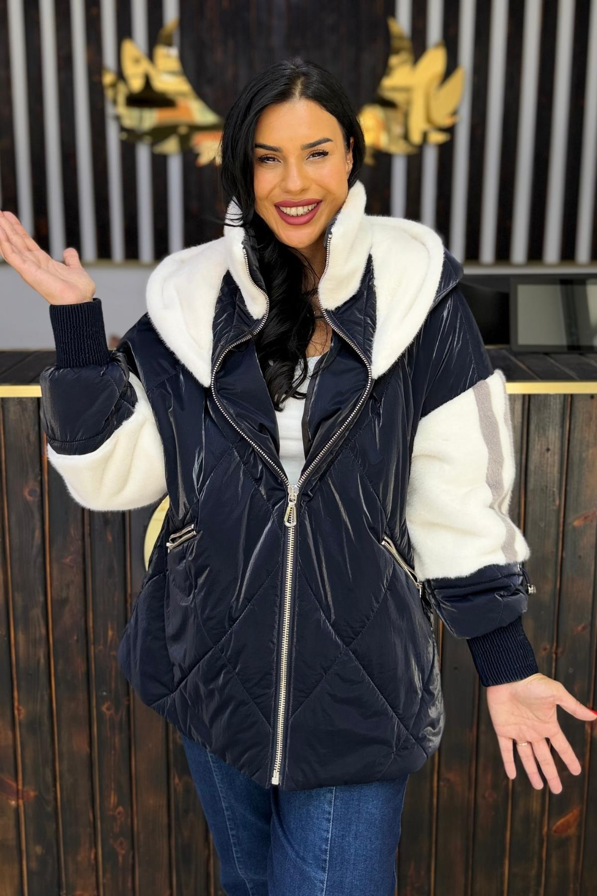KÜRK YAKALI KAPŞONLU MONT LACİVERT BÜYÜK BEDEN