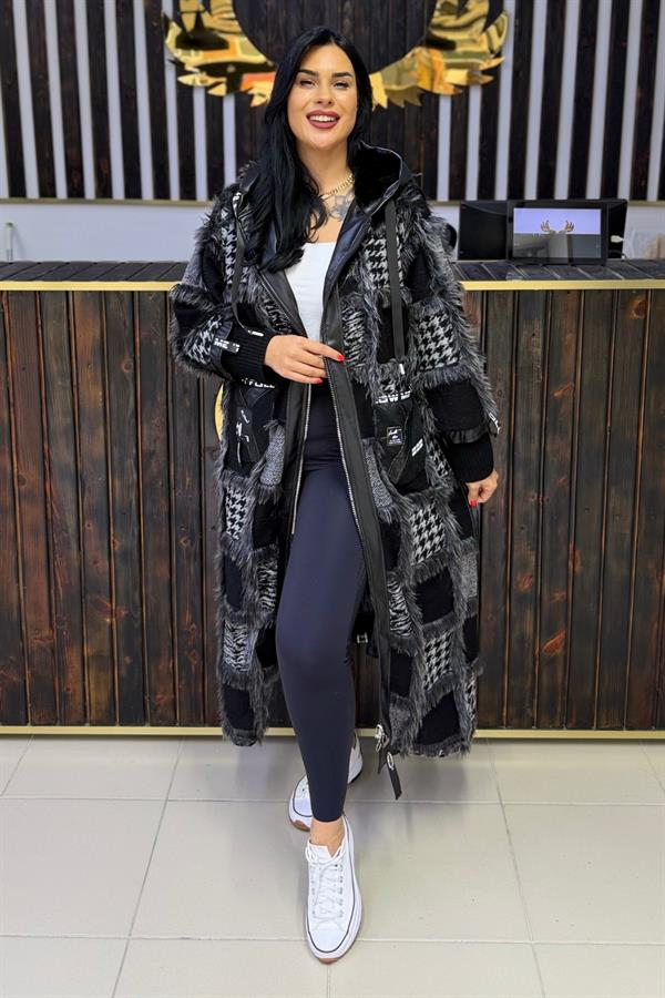 PATCHWORK İÇİ KÜRKLÜ UZUN SİYAH BÜYÜK BEDEN